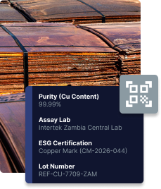 Cathodes receive tokens with assay results, purity, lot numbers, and certifications—verifiable instantly by buyers, auditors, and customs officials.